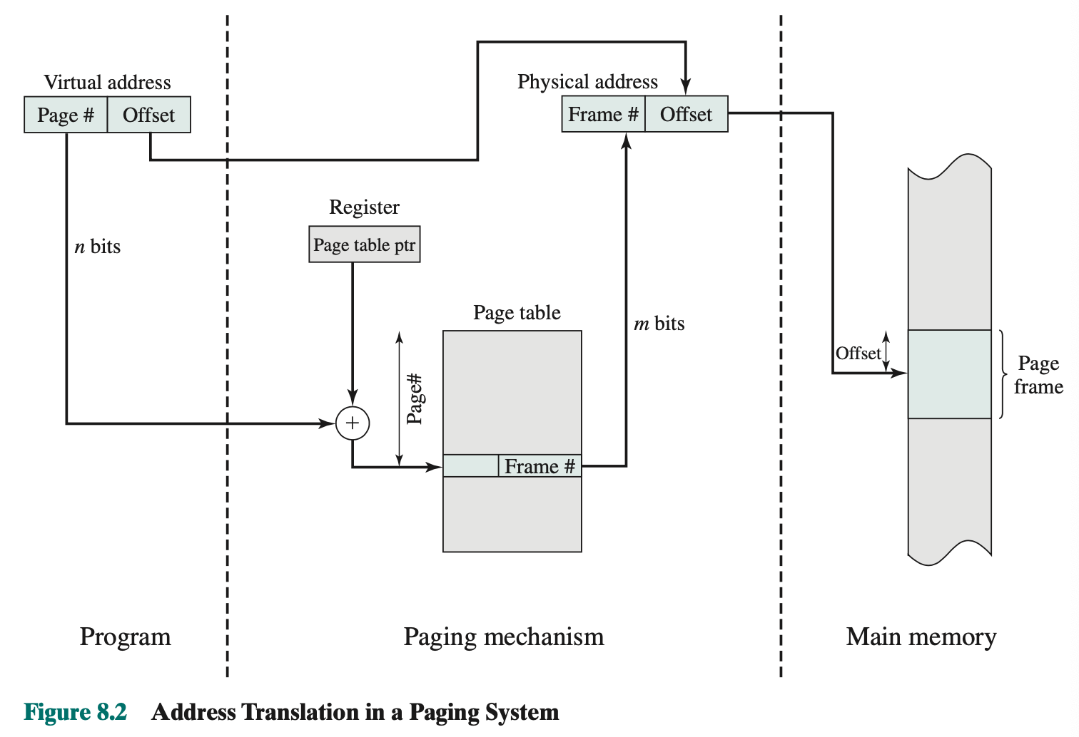 - The basic mechanism for reading a word from memory involves the translation of a virtual, or logical, address, consisting of page number and offset, into a physical address, consisting of frame number and offset, using a page table.
