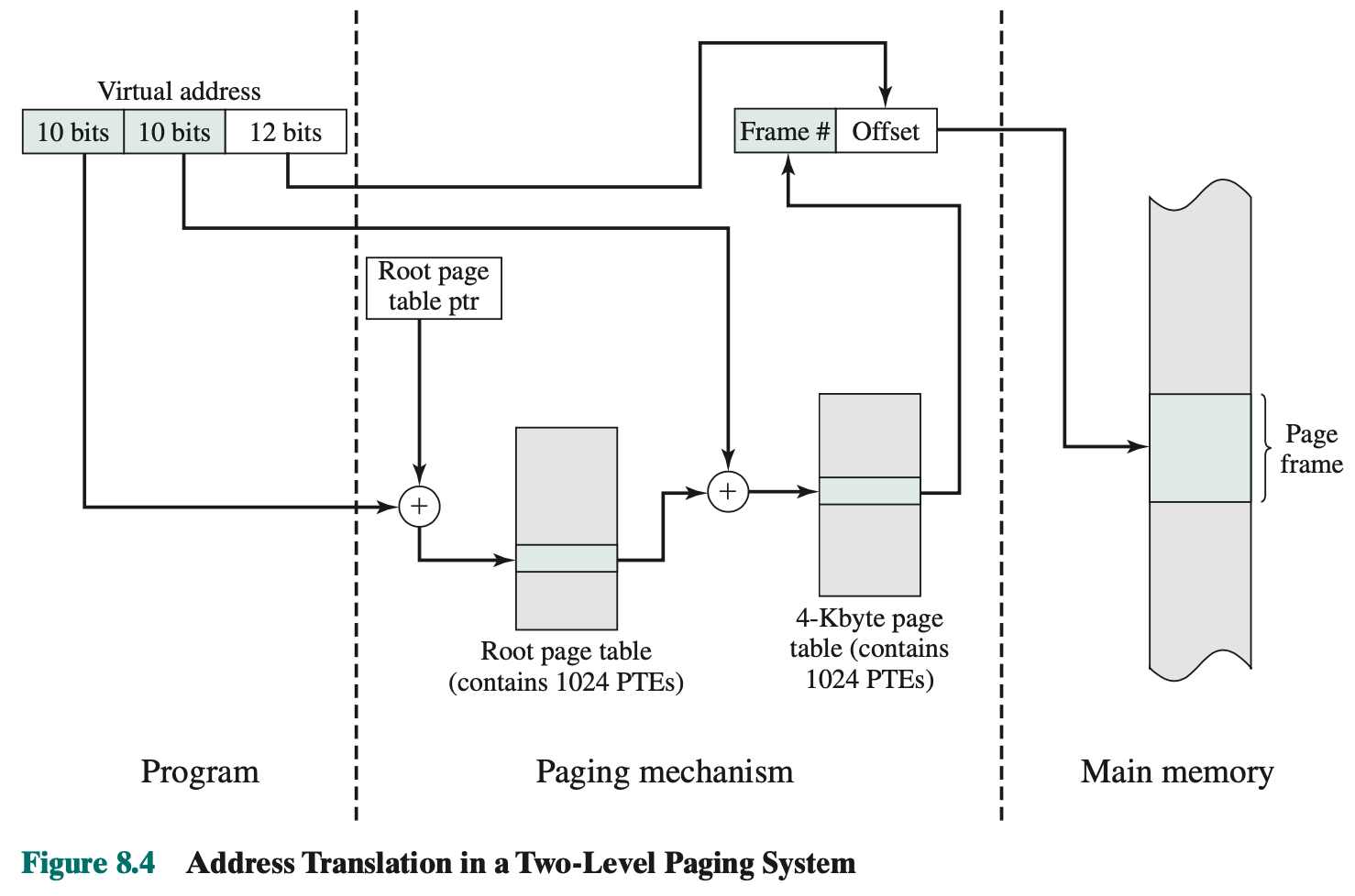 - page tables are subject to paging just as other pages are. When a process is running, at least a part of its page table must be in main memory, including the page table entry of the currently executing page