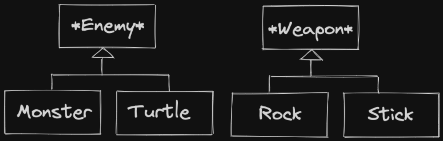 };We can override this in Rock and Stick, but we don’t know which enemy we’re hitting. Same problem exists in reverse if we implement it inside of Enemy.