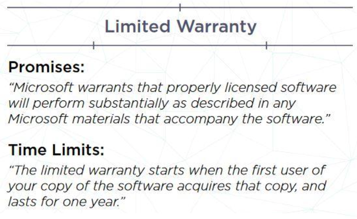In Microsoft’s limited warranty, in the event of a breach of warranty (that is, if the software does not perform substantially as described in its documentation), the only possible remedy is the repair or replacement of the software.
