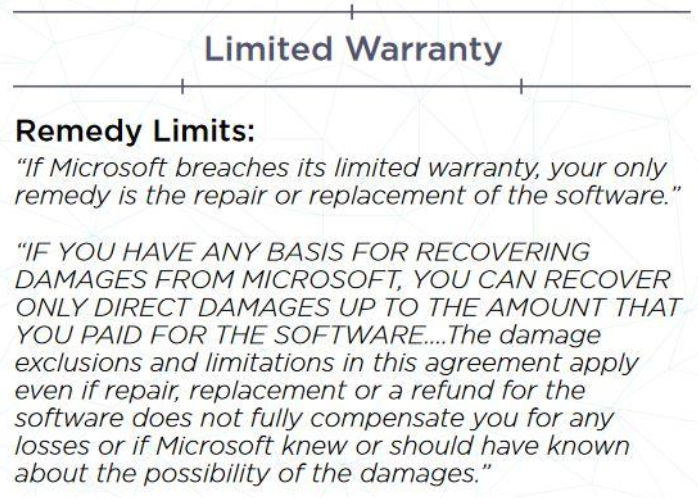 Further, if Microsoft is liable for any damages for any reason, the compensation for those damages caps at the amount that the user paid for the software. Thus, even if the user suffers extensive losses (such as the loss of data critical to the user’s business), the user is unlikely to recover any more than the price of the software.