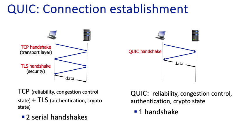 - QUIC’s Approach: QUIC integrates the handshake processes into a single step, reducing the time to establish a secure, reliable connection. This unified handshake also includes provisions for congestion control, authentication, and encryption, all within one round trip time (RTT).