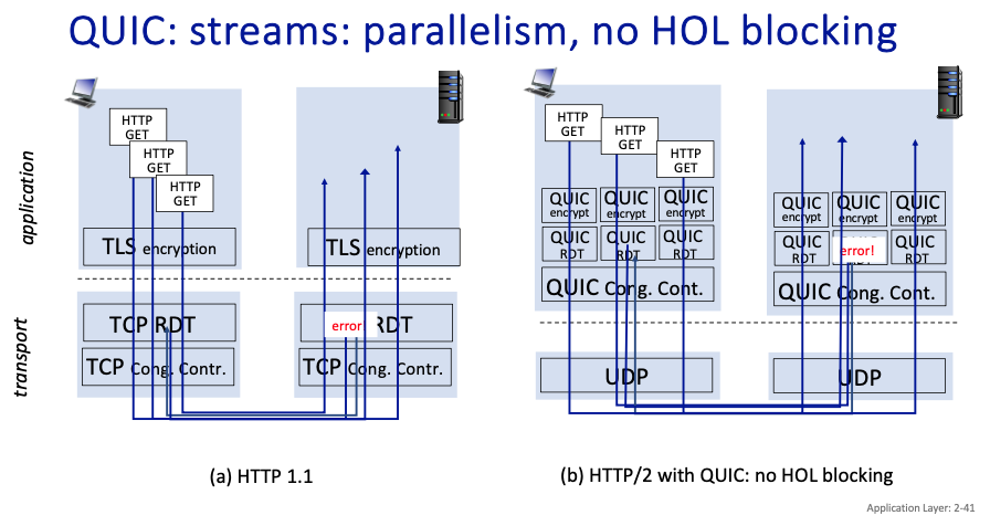 Multiple application-level “streams” multiplexed over single QUIC connection