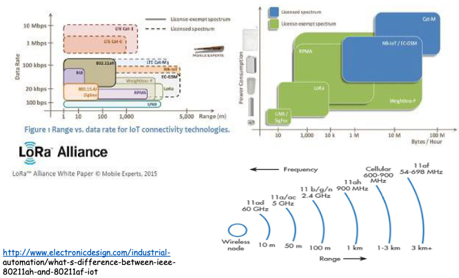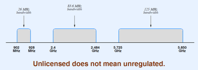 - Wi-Fi: unlicensed (free) spectrum (2.4 GHz and 5.3 GHz)