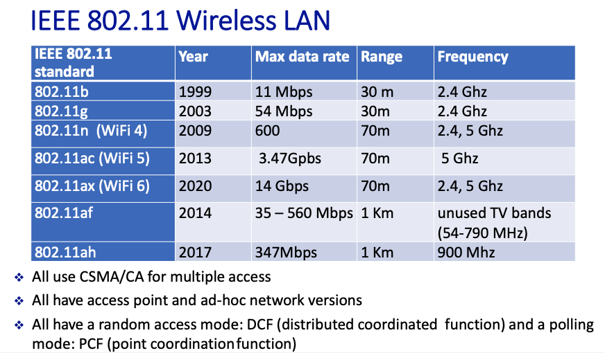- IEEE 802.11 Standards Overview: This includes various Wi-Fi standards such as 802.11a/b/g/n/ac/ax, each offering different speeds, ranges, and frequencies. For instance, 802.11n (Wi-Fi 4) operates on both 2.4 GHz and 5 GHz bands, while 802.11ac (Wi-Fi 5) operates only on 5 GHz.