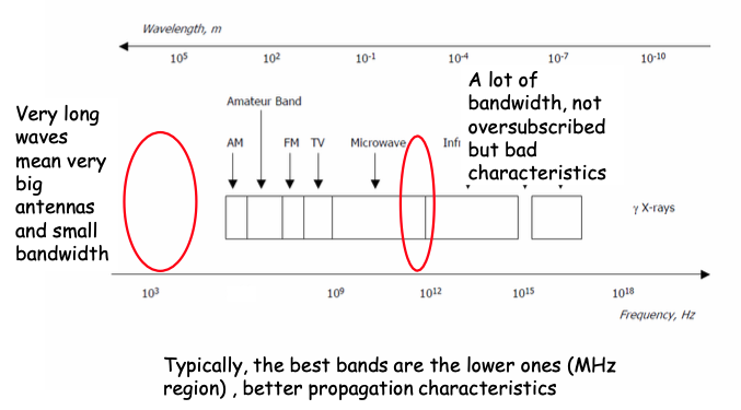- There is plenty of bandwidth at very high frequencies but bad propagation characteristics