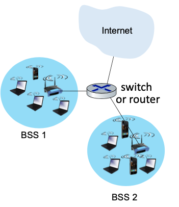 - Basic Service Set (BSS) (aka “cell”) in infrastructure mode contains: