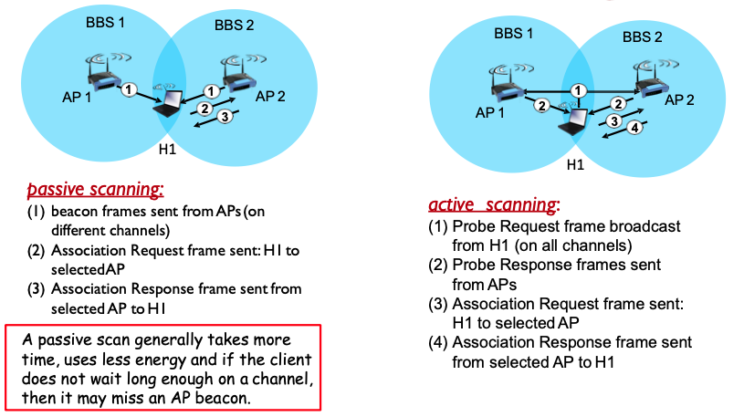 - It involves sending a probe request to each channel and waiting for a probe response from APs, followed by association requests and responses once a suitable AP is selected.