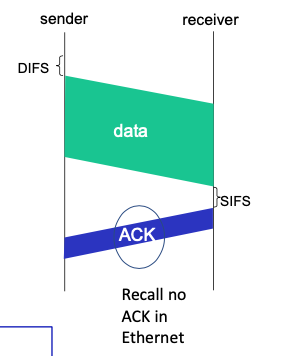 SIFS<DIFS(ACK needed due to hidden terminal problem and bad channel conditions)- SIFS < DIFS (because we prioritize ack over other transmissions)