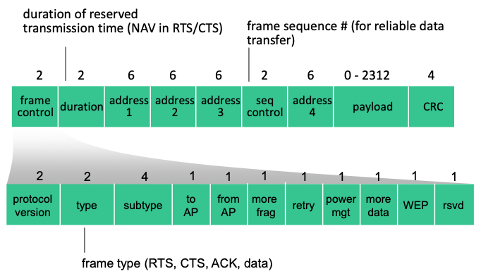 - Frame Control: contains protocol version, type, and subtype info that dictates how the rest of the frame is interpreted
