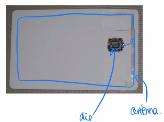 This is a chip card and the silicon die is placed here with wires going around which are antenna. Different kind of packaging of the silicon die. This is a credit card.