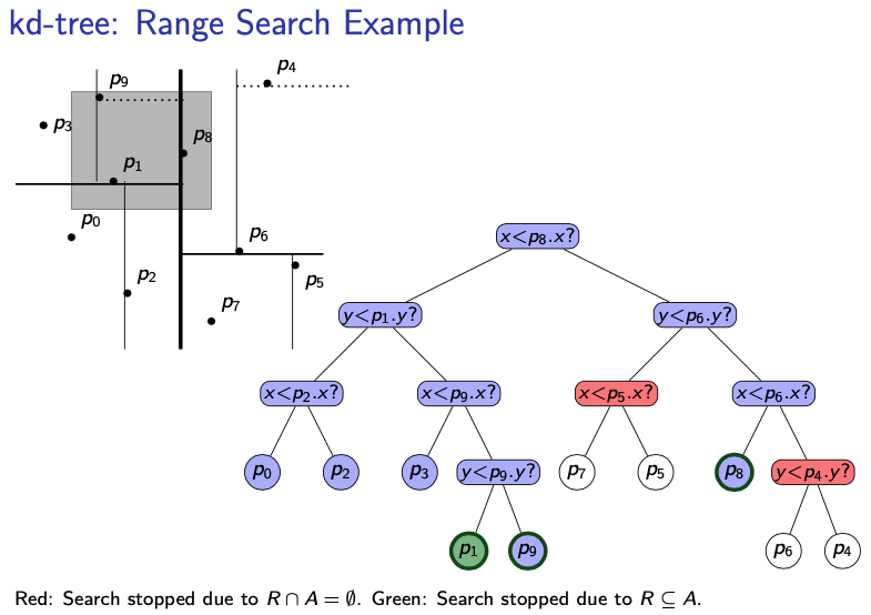 - (for single point): as in binary search tree using indicated coordinate