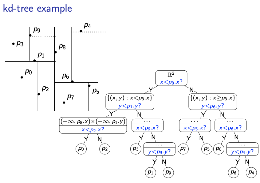 - Create right subtree recursively (splitting by y) for points . Building with initial y-split symmetric.