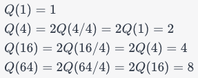 - As we can see, the values of Q(n) seem to be doubling with each step when is a power of 4. Specifically, , where is the number of times we can divide by 4 until we reach 1. This is the same as the logarithm of to the base 4.